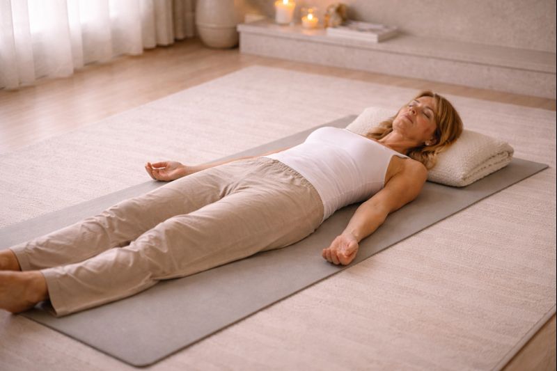This isn’t a long or intense practice. Most days it’s about 20 minutes, on my mat and that’s enough. The goal isn’t to push or perfect anything — it’s to help my body open up and not feel so tight. During this time, I also turn on my red light therapy lamp and let it shine on me while I’m moving gently.